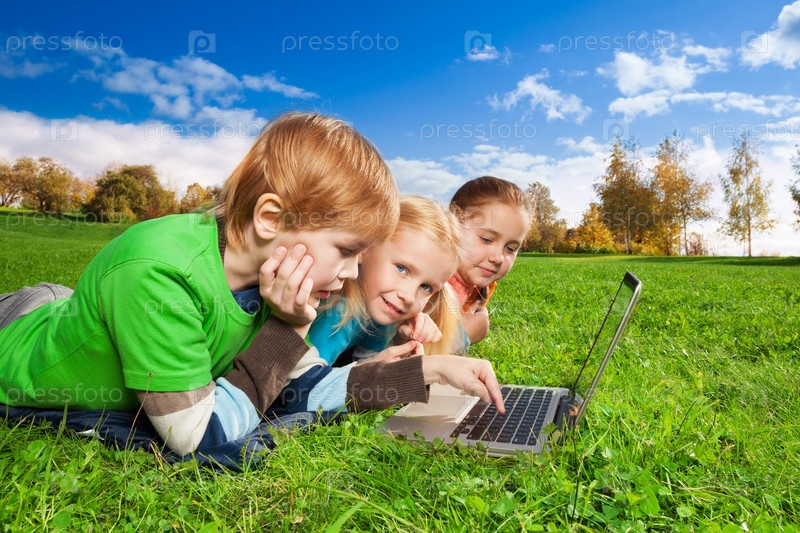 Умные дети используют интернет в парке