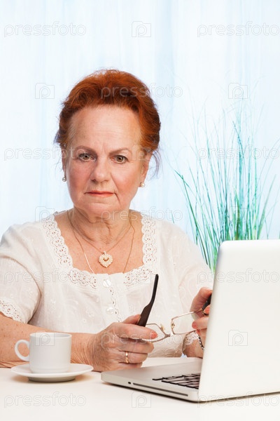 Пожилая женщина, сидящая с ноутбуком