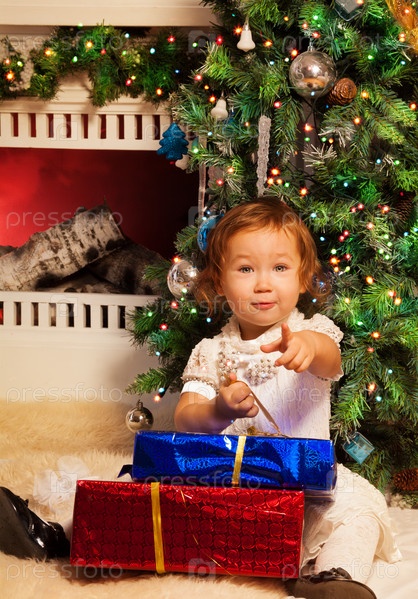 Маленькая девочка у рождественской елки