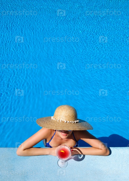 Женщина у бассейна с коктейлем