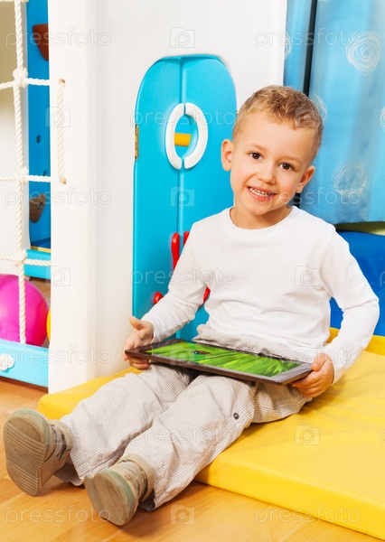 Счастливый маленький мальчик с гаджетом