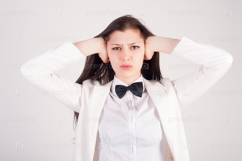 Привлекательная женщина, закрывающая руками свои уши