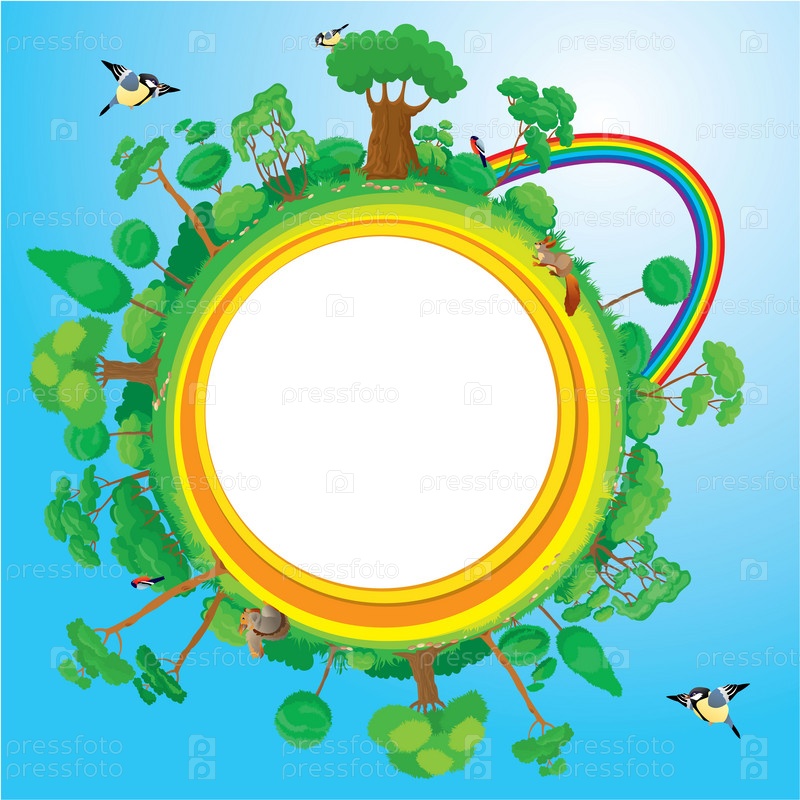 Земной шар с зелеными деревьями, птицами и животными. Концепция экологии планеты