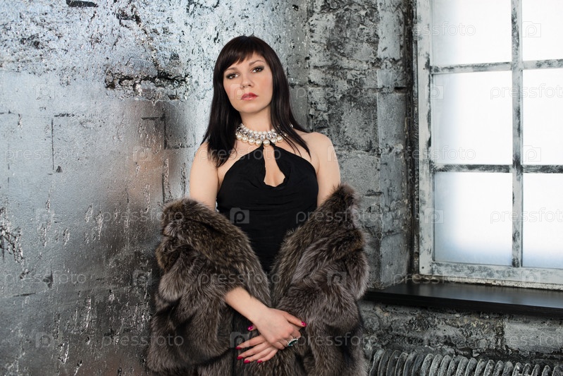 Молодая чувственная женщина в шубе стоит у окна