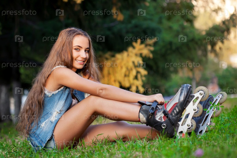 Девушка в роликах на траве