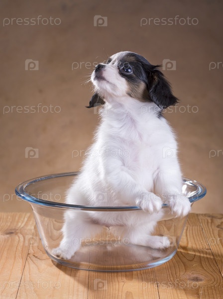 Щенок Папиллона в миске