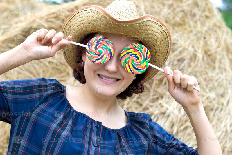Улыбающаяся девушка в шляпе закрывает глаза леденцами
