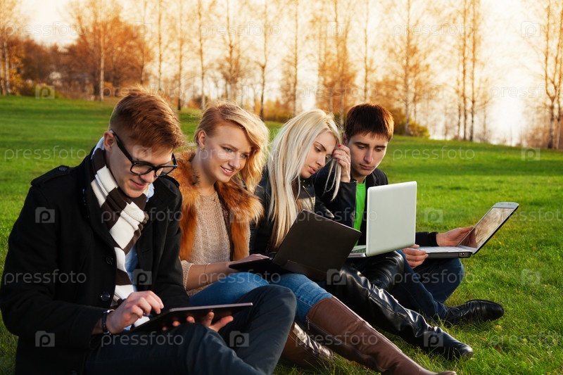 Четверо студентов с ноутбуками в парке