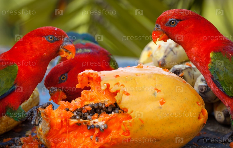 Радужные лорикеты едят манго в гнезде