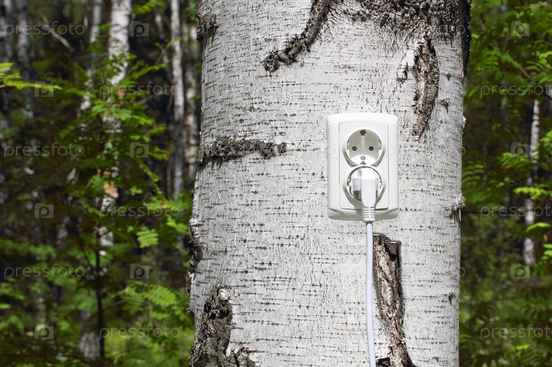 Электрическая розетка с вилкой на дереве