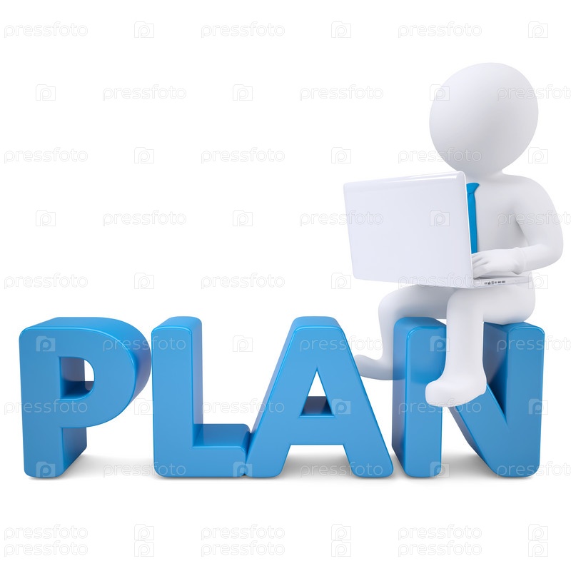 3D белый человек с ноутбуком сидит на слове 'план'