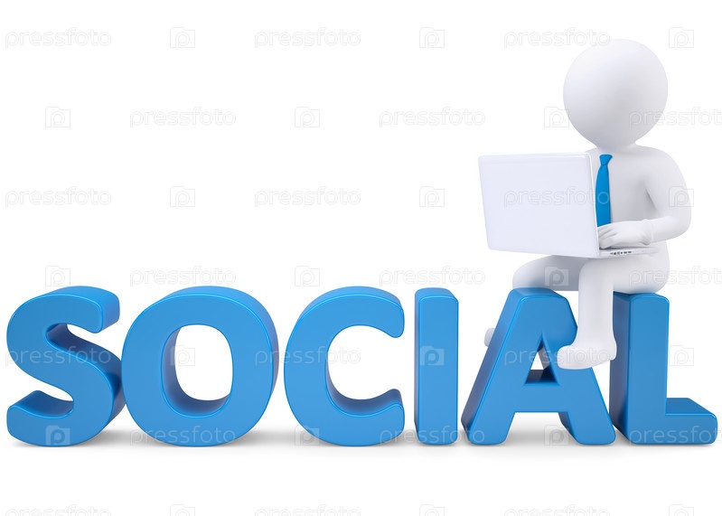 3D-человек с ноутбуком сидит на слове 'SOCIAL'