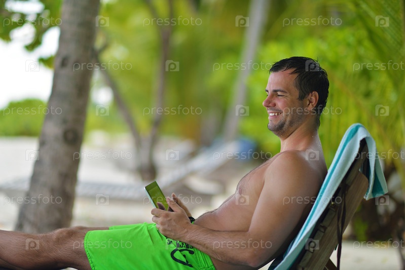 Мужчина с планшетом отдыхает на пляже