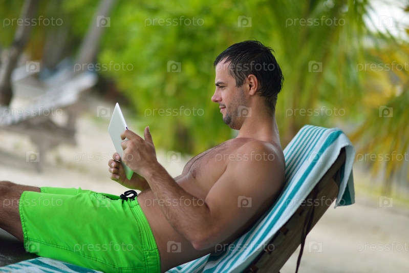 Мужчина с планшетом отдыхает на пляже