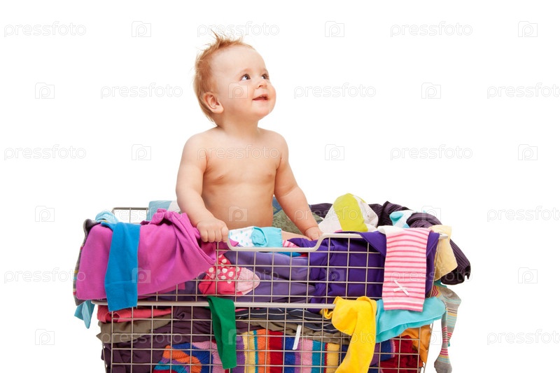 Малыш, сидящий в корзине с одеждой