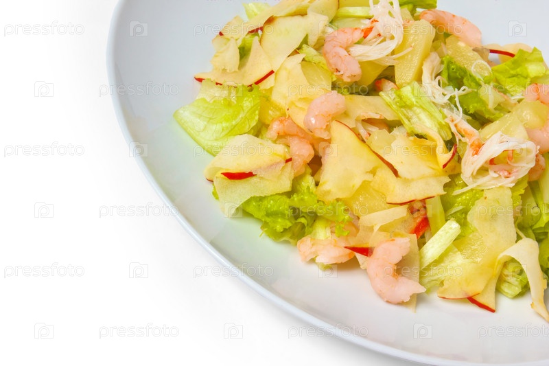 Салат из креветок и яблока, изолированный на белом фоне