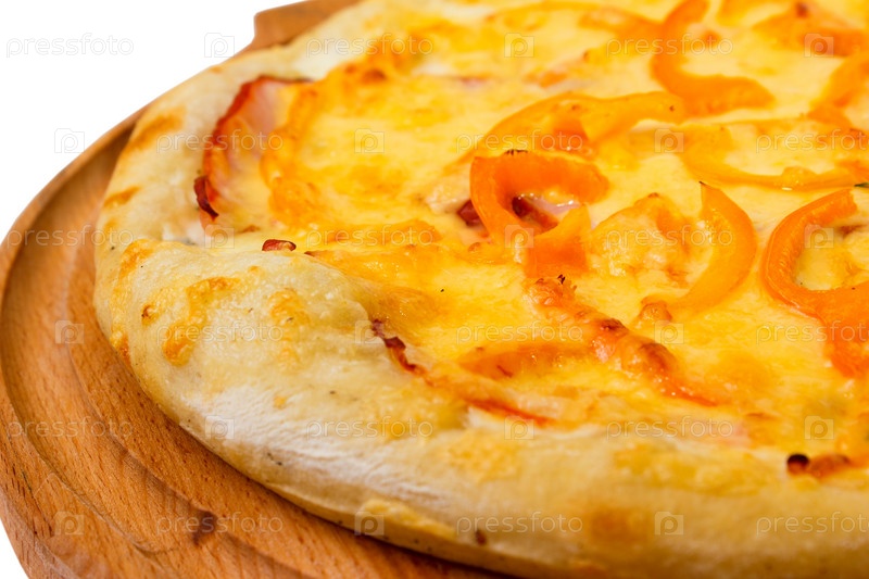 Аппетитная пицца на деревянном лотке, изолированная на белом фоне