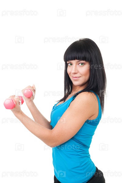 Счастливая женщина с розовыми гантелями