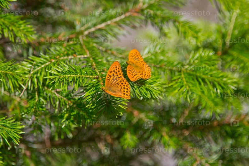 Оранжевая бабочка на ветке ели
