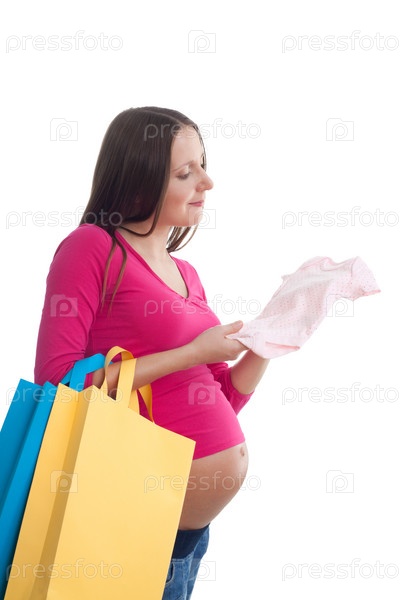 Беременная женщина выбирает детскую одежду