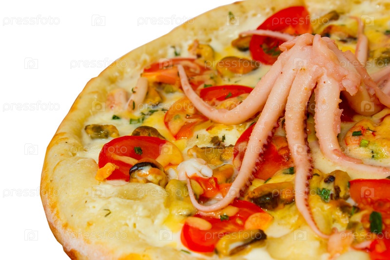 Пицца с морепродуктами и большим осьминогом на белом фоне