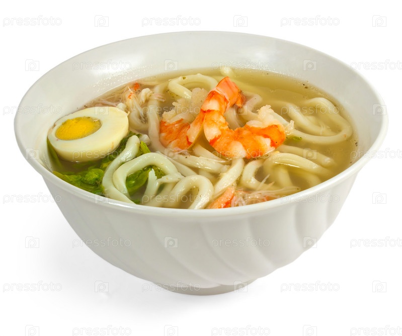 Суп с макаронами и яйцом на белом фоне