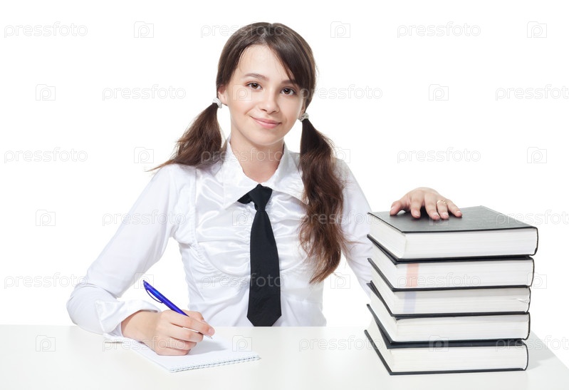 Счастливая школьница со стопкой книг