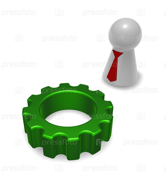 Колесо с зубами и человечек в галстуке. 3d иллюстрация
