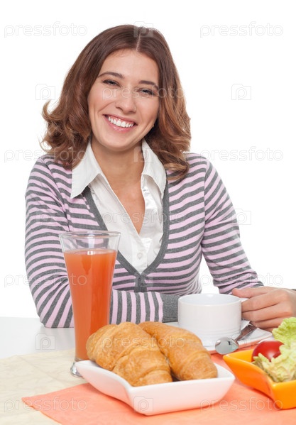 Счастливая женщина завтракает
