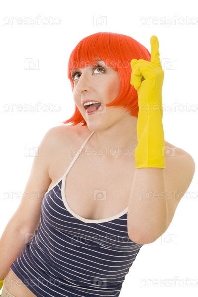 Женщина с рыжими волосами и в желтых перчатках показывает пальцем, изолированная