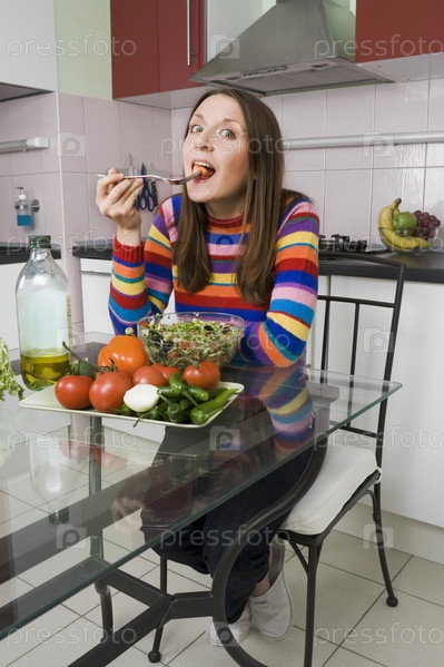 Женщина ест салат на кухне