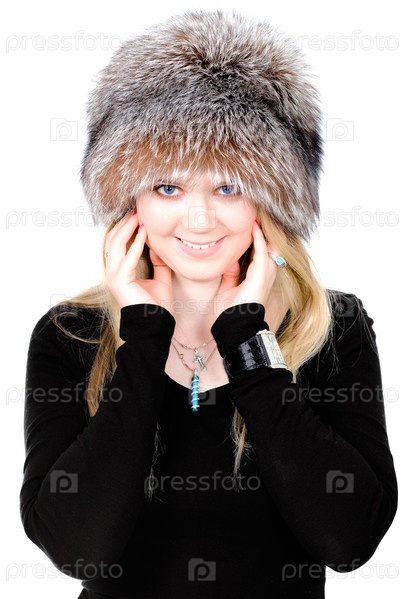Блондинка в меховой шапке на белом фоне