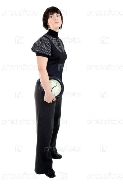 Европейская женщина, держащая настенные часы, изолированная на белом фоне