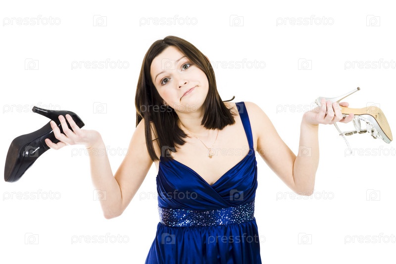 Женщина выбирает между черными и белыми туфлями, стоя в синем платье
