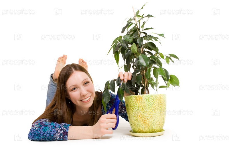 Женщина обрезает растение ножницами, лежа на полу