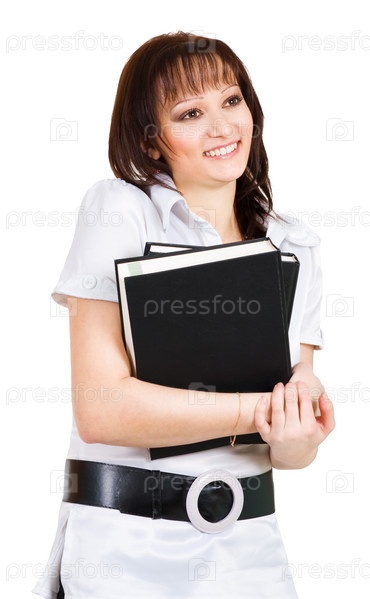 Застенчивая женщина стоит с книгами