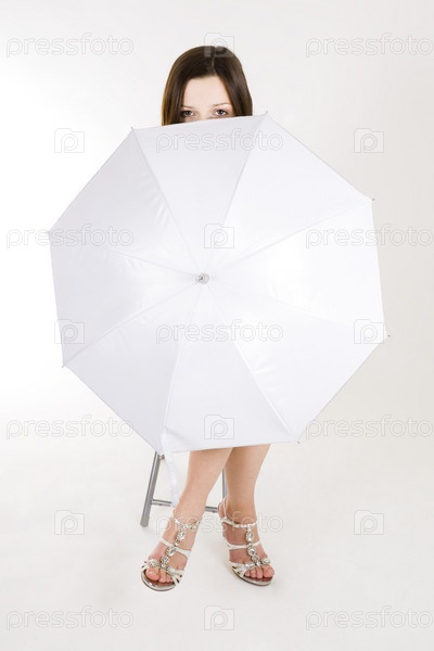 Молодая красивая женщина за ярким зонтом и в яркой обуви