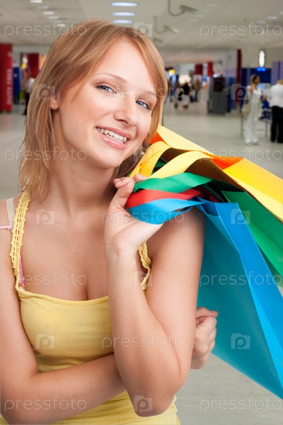 Счастливая женщина в торговом центре