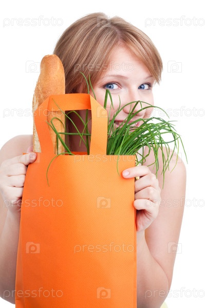 Женщина прикрываяется сумкой