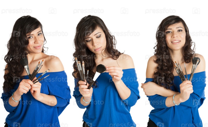 Коллаж, женщины с кистью для макияжа