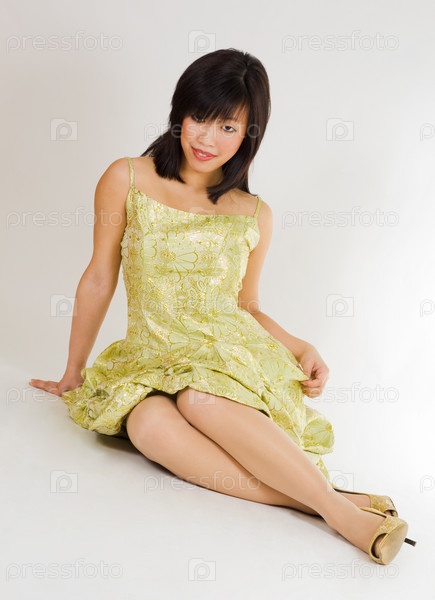 Очаровательная улыбающаяся азиатская женщина сидит в золотом вечернем платье