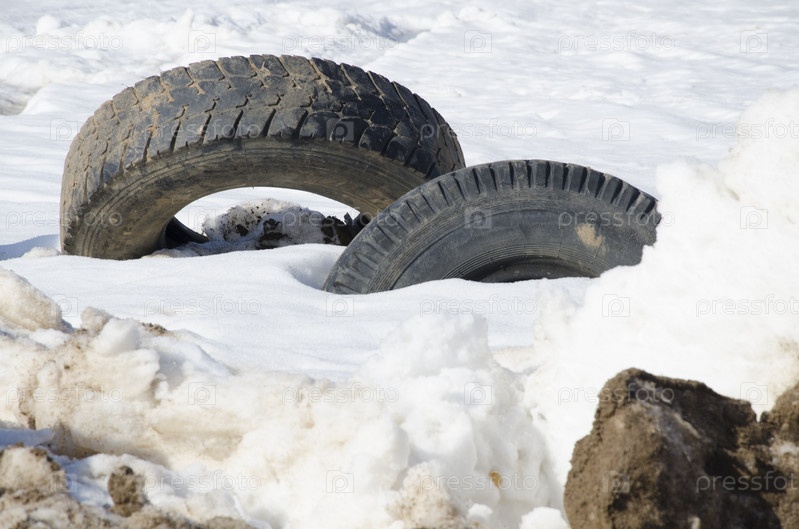 Брошенная резина от грузовиков в снегу - проблема утилизации старых шин