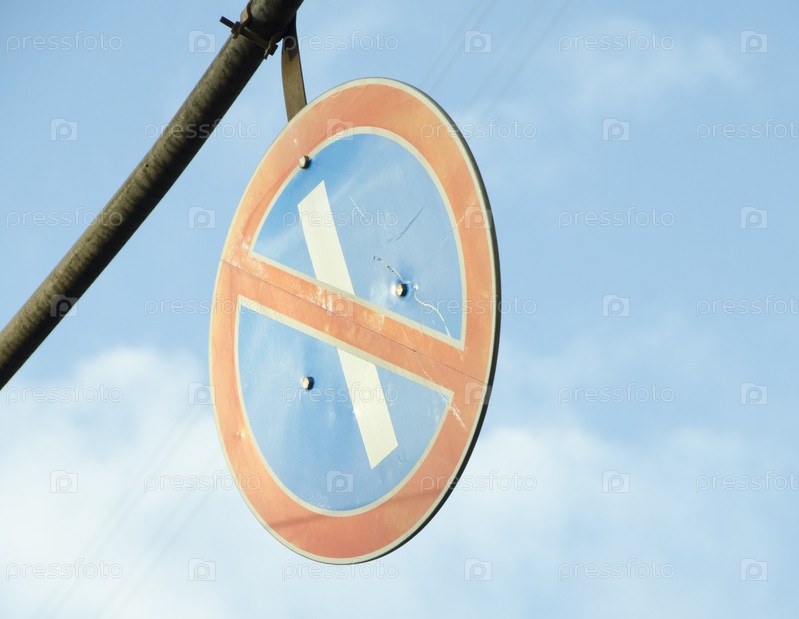 Дорожный знак "стоянка запрещена по нечетным числам" на фоне голубого неба с облаками висит на перекладине