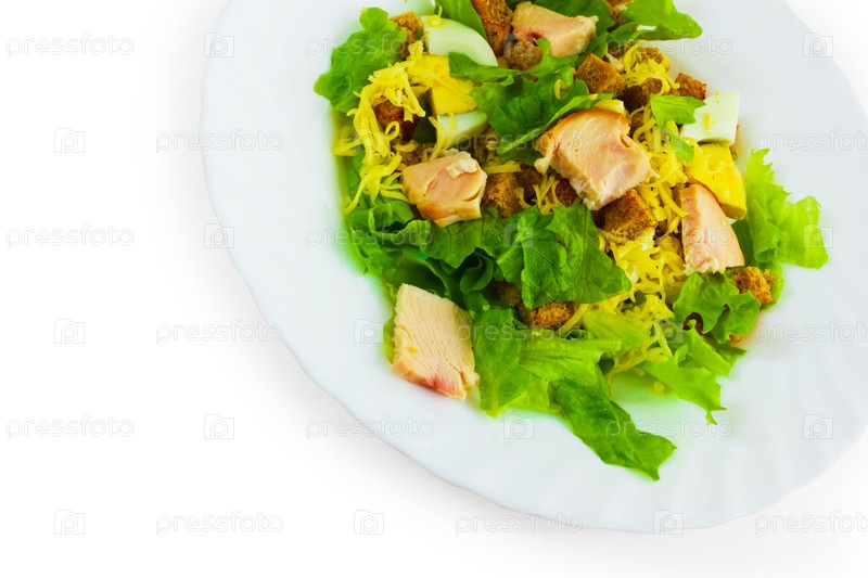 Сыр, колбаса и хлеб в салате, изолированные на белом фоне