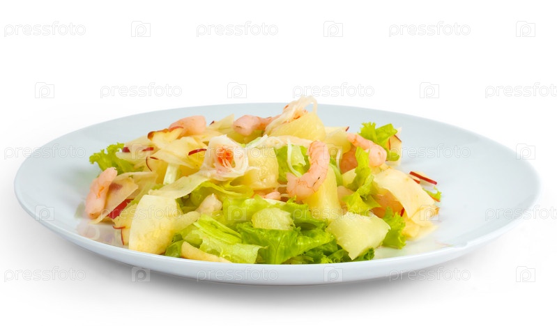 Вкусный салат из креветок и яблок, изолированный на белом фоне