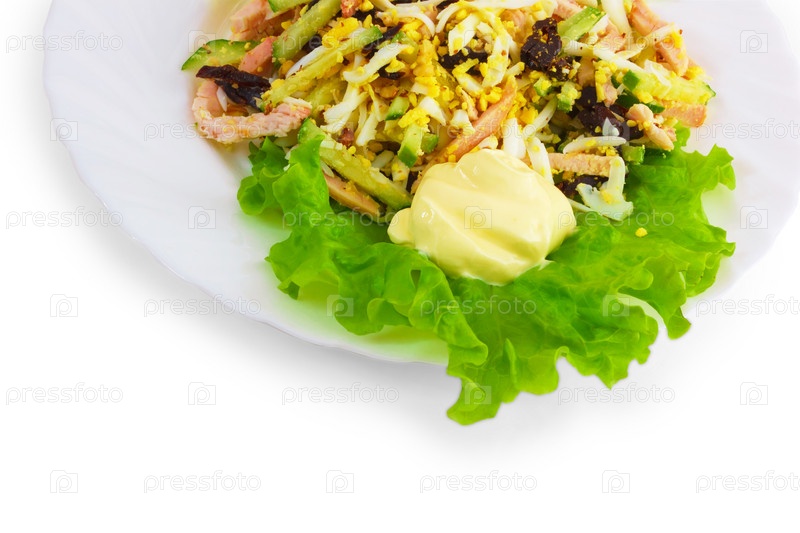 Салат с колбасой на тарелке, изолированной на белом фоне