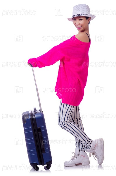Молодая женщина готова к отпуску на белом фоне