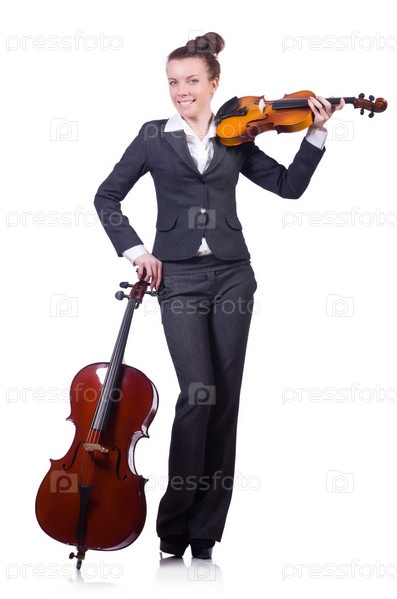 Бизнес-леди со скрипкой, изолированная на белом фоне