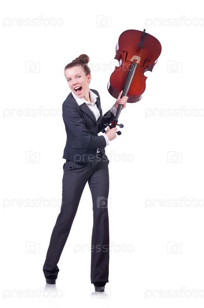 Бизнес-леди со скрипкой, изолированная на белом фоне