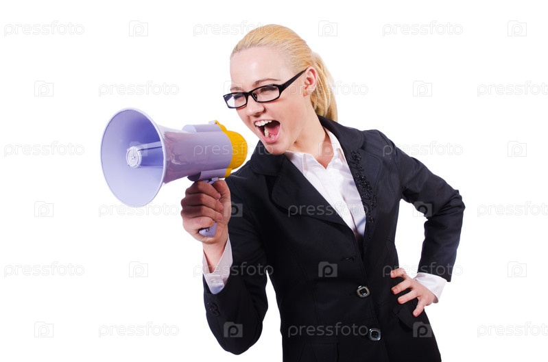 Женщина-предприниматель с громкоговорителем на белом фоне